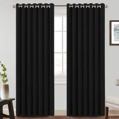 READY MADE: 2 panels per package. Each panel measures 90" wide x 90" long (total width is 180") , with 14 anti-rust grommets which fit curtain rods less than 1.6" diameter BLACKOUT EFFECT: With black liner on backing, curtains can definitely block out 100% bright sunlight and UV ray,bring you sound dreams and protect your furniture from color fading MULTIPLE FUNCTIONS: Made by advanced triple weave technology, high-density blackout fabric curtains can high performance on thermal insulated, room darkening, noise reducing and privacy protection UNIQUE HOME DECOR: These classic curtain panels will decorate your rooms with new great effect, suits for contemporary, traditional, vintage rustic, victorian home styles. No chemical coating, no formaldehyde, bring harmonious to your family MACHINE WASHABLE: Machine washable for easy care and maintenance, use only non-chlorine bleach when needed, tumble dry low and warm iron as needed
