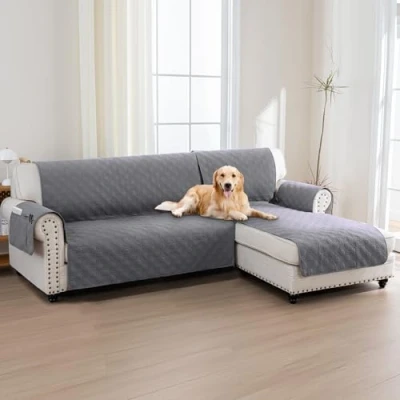 BellaHills 100% Waterproof Couch Covers for Sectional Sofa 2 Piece Chaise Cover L Shaped Dogs Non Slip (Right Lounge + 3 Seat Cover, Grey)