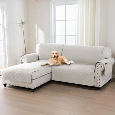 BellaHills 100% Waterproof Sofa Cover L Shape 2 Piece Couch Covers Sectional Chaise Slipcovers Non Slip Furniture Protectors for Dogs (Left Lounge + Seat Cover, Beige)