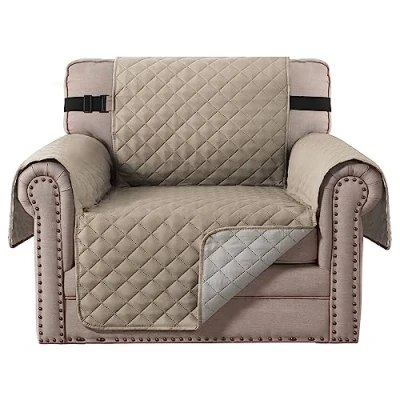 BellaHills Reversible Chair Covers Water Repellent Sofa Cover 1 Seater Slipcover from Pets for Cats Checked Pattern Thick Quilted with Elastic Strap (Chair, Khaki/Beige)