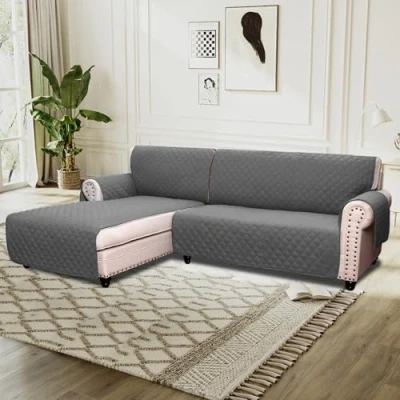 2-PIECES DESIGN: It consists of 2 pieces, namely chaise cover and the main slipcover. In addition, the unique design will fit for different types of L shape sofa. Suitable for L-Shape Sofa armrest width up to 20 in, sofa length up to 68 in, chaise width up to 30 in. See Measuring Guide in Photos UPGRADED MATERIAL: This luxury reversible 100% quilted furniture protector is made by plush faux suede fabric, composed of thick foam filling for extra comfort & softness. Chemicals free and high safety, color guaranteed and comfortable, durable and long lasting to your furniture STAY IN PLACE: Double designs prevent covers from moving in everyday use. The elastic loops in each back area to hook the foot of the sofa fix the back of the sofa cover. And the extra arm piece tuck inside help secure the seat and armrests of the sofa cover UNIQUE DECOR: There are 3 pockets on both sides to help you better store items. The beautiful quilted texture with diamond check pattern, lofty poly fill, and microfiber add modern concise style and stylish to your furniture, also save your cost renew your old furniture. It is not only the furniture cover, but the decorative home artist EASY CARE: Machine washable for easy care and maintenance, separately in cold water on the gentle cycle, do not use bleach. Kindly note though our innovated material has featured water prevent, but it is not 100% waterproof, we suggest you remove it within 5 minutes after accident