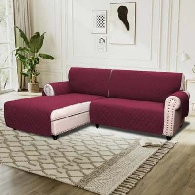 2-PIECES DESIGN: It consists of 2 pieces, namely chaise cover and the main slipcover. In addition, the unique design will fit for different types of L shape sofa. Suitable for L-Shape Sofa armrest width up to 20 in, sofa length up to 51 in, chaise width up to 30 in. See Measuring Guide in Photos UPGRADED MATERIAL: This luxury reversible 100% quilted furniture protector is made by plush faux suede fabric, composed of thick foam filling for extra comfort & softness. Chemicals free and high safety, color guaranteed and comfortable, durable and long lasting to your furniture STAY IN PLACE: Double designs prevent covers from moving in everyday use. The elastic loops in each back area to hook the foot of the sofa fix the back of the sofa cover. And the extra arm piece tuck inside help secure the seat and armrests of the sofa cover UNIQUE DECOR: There are 3 pockets on both sides to help you better store items. The beautiful quilted texture with diamond check pattern, lofty poly fill, and microfiber add modern concise style and stylish to your furniture, also save your cost renew your old furniture. It is not only the furniture cover, but the decorative home artist EASY CARE: Machine washable for easy care and maintenance, separately in cold water on the gentle cycle, do not use bleach. Kindly note though our innovated material has featured water prevent, but it is not 100% waterproof, we suggest you remove it within 5 minutes after accident