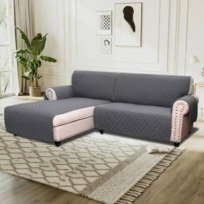 2-PIECES DESIGN: It consists of 2 pieces, namely chaise cover and the main slipcover. In addition, the unique design will fit for different types of L shape sofa. Suitable for L-Shape Sofa armrest width up to 20 in, sofa length up to 51 in, chaise width up to 30 in. See Measuring Guide in Photos UPGRADED MATERIAL: This luxury reversible 100% quilted furniture protector is made by plush faux suede fabric, composed of thick foam filling for extra comfort & softness. Chemicals free and high safety, color guaranteed and comfortable, durable and long lasting to your furniture STAY IN PLACE: Double designs prevent covers from moving in everyday use. The elastic loops in each back area to hook the foot of the sofa fix the back of the sofa cover. And the extra arm piece tuck inside help secure the seat and armrests of the sofa cover UNIQUE DECOR: There are 3 pockets on both sides to help you better store items. The beautiful quilted texture with diamond check pattern, lofty poly fill, and microfiber add modern concise style and stylish to your furniture, also save your cost renew your old furniture. It is not only the furniture cover, but the decorative home artist EASY CARE: Machine washable for easy care and maintenance, separately in cold water on the gentle cycle, do not use bleach. Kindly note though our innovated material has featured water prevent, but it is not 100% waterproof, we suggest you remove it within 5 minutes after accident