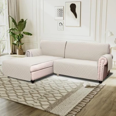 2-PIECES DESIGN: It consists of 2 pieces, namely chaise cover and the main slipcover. In addition, the unique design will fit for different types of L shape sofa. Suitable for L-Shape Sofa armrest width up to 20 in, sofa length up to 68 in, chaise width up to 30 in. See Measuring Guide in Photos UPGRADED MATERIAL: This luxury reversible 100% quilted furniture protector is made by plush faux suede fabric, composed of thick foam filling for extra comfort & softness. Chemicals free and high safety, color guaranteed and comfortable, durable and long lasting to your furniture STAY IN PLACE: Double designs prevent covers from moving in everyday use. The elastic loops in each back area to hook the foot of the sofa fix the back of the sofa cover. And the extra arm piece tuck inside help secure the seat and armrests of the sofa cover UNIQUE DECOR: There are 3 pockets on both sides to help you better store items. The beautiful quilted texture with diamond check pattern, lofty poly fill, and microfiber add modern concise style and stylish to your furniture, also save your cost renew your old furniture. It is not only the furniture cover, but the decorative home artist EASY CARE: Machine washable for easy care and maintenance, separately in cold water on the gentle cycle, do not use bleach. Kindly note though our innovated material has featured water prevent, but it is not 100% waterproof, we suggest you remove it within 5 minutes after accident