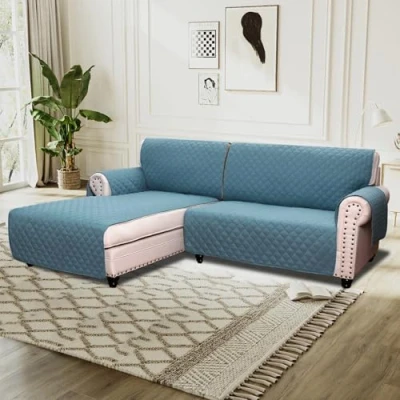 2-PIECES DESIGN: It consists of 2 pieces, namely chaise cover and the main slipcover. In addition, the unique design will fit for different types of L shape sofa. Suitable for L-Shape Sofa armrest width up to 20 in, sofa length up to 51 in, chaise width up to 30 in. See Measuring Guide in Photos UPGRADED MATERIAL: This luxury reversible 100% quilted furniture protector is made by plush faux suede fabric, composed of thick foam filling for extra comfort & softness. Chemicals free and high safety, color guaranteed and comfortable, durable and long lasting to your furniture STAY IN PLACE: Double designs prevent covers from moving in everyday use. The elastic loops in each back area to hook the foot of the sofa fix the back of the sofa cover. And the extra arm piece tuck inside help secure the seat and armrests of the sofa cover UNIQUE DECOR: There are 3 pockets on both sides to help you better store items. The beautiful quilted texture with diamond check pattern, lofty poly fill, and microfiber add modern concise style and stylish to your furniture, also save your cost renew your old furniture. It is not only the furniture cover, but the decorative home artist EASY CARE: Machine washable for easy care and maintenance, separately in cold water on the gentle cycle, do not use bleach. Kindly note though our innovated material has featured water prevent, but it is not 100% waterproof, we suggest you remove it within 5 minutes after accident