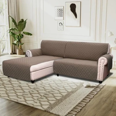 2-PIECES DESIGN: It consists of 2 pieces, namely chaise cover and the main slipcover. In addition, the unique design will fit for different types of L shape sofa. Suitable for L-Shape Sofa armrest width up to 20 in, sofa length up to 51 in, chaise width up to 30 in. See Measuring Guide in Photos UPGRADED MATERIAL: This luxury reversible 100% quilted furniture protector is made by plush faux suede fabric, composed of thick foam filling for extra comfort & softness. Chemicals free and high safety, color guaranteed and comfortable, durable and long lasting to your furniture STAY IN PLACE: Double designs prevent covers from moving in everyday use. The elastic loops in each back area to hook the foot of the sofa fix the back of the sofa cover. And the extra arm piece tuck inside help secure the seat and armrests of the sofa cover UNIQUE DECOR: There are 3 pockets on both sides to help you better store items. The beautiful quilted texture with diamond check pattern, lofty poly fill, and microfiber add modern concise style and stylish to your furniture, also save your cost renew your old furniture. It is not only the furniture cover, but the decorative home artist EASY CARE: Machine washable for easy care and maintenance, separately in cold water on the gentle cycle, do not use bleach. Kindly note though our innovated material has featured water prevent, but it is not 100% waterproof, we suggest you remove it within 5 minutes after accident