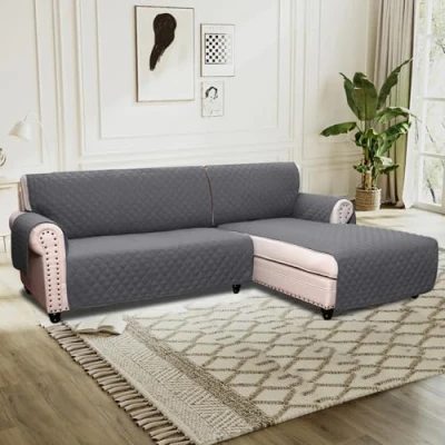 2-PIECES DESIGN: It consists of 2 pieces, namely chaise cover and the main slipcover. In addition, the unique design will fit for different types of L shape sofa. Suitable for L-Shape Sofa armrest width up to 20 in, sofa length up to 68 in, chaise width up to 30 in. See Measuring Guide in Photos UPGRADED MATERIAL: This luxury reversible 100% quilted furniture protector is made by plush faux suede fabric, composed of thick foam filling for extra comfort & softness. Chemicals free and high safety, color guaranteed and comfortable, durable and long lasting to your furniture STAY IN PLACE: Double designs prevent covers from moving in everyday use. The elastic loops in each back area to hook the foot of the sofa fix the back of the sofa cover. And the extra arm piece tuck inside help secure the seat and armrests of the sofa cover UNIQUE DECOR: There are 3 pockets on both sides to help you better store items. The beautiful quilted texture with diamond check pattern, lofty poly fill, and microfiber add modern concise style and stylish to your furniture, also save your cost renew your old furniture. It is not only the furniture cover, but the decorative home artist EASY CARE: Machine washable for easy care and maintenance, separately in cold water on the gentle cycle, do not use bleach. Kindly note though our innovated material has featured water prevent, but it is not 100% waterproof, we suggest you remove it within 5 minutes after accident