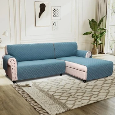 2-PIECES DESIGN: It consists of 2 pieces, namely chaise cover and the main slipcover. In addition, the unique design will fit for different types of L shape sofa. Suitable for L-Shape Sofa armrest width up to 20 in, sofa length up to 68 in, chaise width up to 30 in. See Measuring Guide in Photos UPGRADED MATERIAL: This luxury reversible 100% quilted furniture protector is made by plush faux suede fabric, composed of thick foam filling for extra comfort & softness. Chemicals free and high safety, color guaranteed and comfortable, durable and long lasting to your furniture STAY IN PLACE: Double designs prevent covers from moving in everyday use. The elastic loops in each back area to hook the foot of the sofa fix the back of the sofa cover. And the extra arm piece tuck inside help secure the seat and armrests of the sofa cover UNIQUE DECOR: There are 3 pockets on both sides to help you better store items. The beautiful quilted texture with diamond check pattern, lofty poly fill, and microfiber add modern concise style and stylish to your furniture, also save your cost renew your old furniture. It is not only the furniture cover, but the decorative home artist EASY CARE: Machine washable for easy care and maintenance, separately in cold water on the gentle cycle, do not use bleach. Kindly note though our innovated material has featured water prevent, but it is not 100% waterproof, we suggest you remove it within 5 minutes after accident