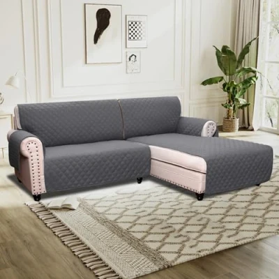 2-PIECES DESIGN: It consists of 2 pieces, namely chaise cover and the main slipcover. In addition, the unique design will fit for different types of L shape sofa. Suitable for L-Shape Sofa armrest width up to 20 in, sofa length up to 51 in, chaise width up to 30 in. See Measuring Guide in Photos UPGRADED MATERIAL: This luxury reversible 100% quilted furniture protector is made by plush faux suede fabric, composed of thick foam filling for extra comfort & softness. Chemicals free and high safety, color guaranteed and comfortable, durable and long lasting to your furniture STAY IN PLACE: Double designs prevent covers from moving in everyday use. The elastic loops in each back area to hook the foot of the sofa fix the back of the sofa cover. And the extra arm piece tuck inside help secure the seat and armrests of the sofa cover UNIQUE DECOR: There are 3 pockets on both sides to help you better store items. The beautiful quilted texture with diamond check pattern, lofty poly fill, and microfiber add modern concise style and stylish to your furniture, also save your cost renew your old furniture. It is not only the furniture cover, but the decorative home artist EASY CARE: Machine washable for easy care and maintenance, separately in cold water on the gentle cycle, do not use bleach. Kindly note though our innovated material has featured water prevent, but it is not 100% waterproof, we suggest you remove it within 5 minutes after accident
