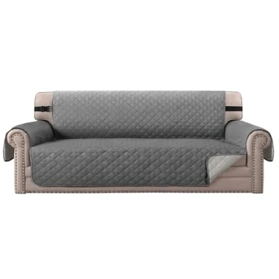 BellaHills Sofa Covers 4 Seater Water Resistant Slipcovers Furniture Protectors for Pets/Kids Soft Thick Quilted Couch Cover Secure with Non Slip Strap (Oversized Sofa, Charcoal Grey/Beige)