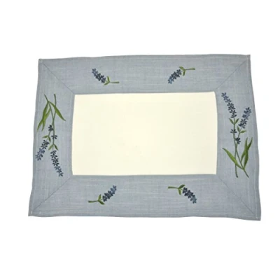 Timeless lavender embroidery placemat. The base colour of the placemat is white with blue border. 100% polyester, washable, can be ironed The square placemat has a linen texture. The size, 35 x 50 cm, is an approximate size specified by the manufacturer.