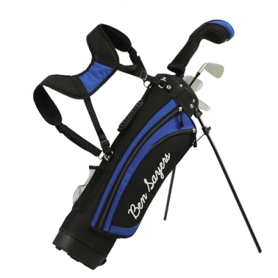 IDEAL STARTER SET: The Ben Sayers M1i Junior Package Set includes all the equipment needed to help young players aged 5-8 years and 9–11 years old take their first steps into the world of golf. Right Hand Sets. STAND BAG: An age-specific and lightweight junior stand bag with a comfortable padded double shoulder strap and a convenient rubber hand strap for easy carrying. The bag has a 5 1/2” top, graphite friendly 4-way divider for convenient club positioning and pop-out stand. Equipped with a useful mesh bottle holder and three different sized zip pockets to ensure there’s plenty of storage space, and a hardwearing base. LIGHTWEIGHT GRAPHITE SHAFTS: All the main clubs are fitted with lightweight performance graphite shafts optimised for junior swing speeds to help younger players develop proper form and technique, and get the ball into the air more easily. DRIVER: The driver is fitted with a mid-kick graphite shaft and weighted sole plate that lowers the centre of gravity to promote a high launch angle, increased distance and forgiveness. IRONS: The two included irons are optimised with a sleek head design with a wide sole and perimeter weighting to offer extra forgiveness and increased playability.