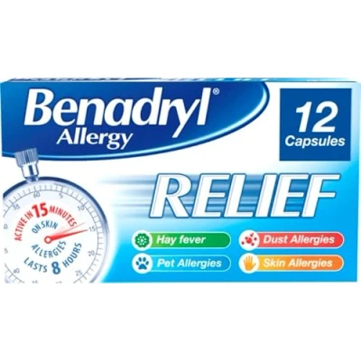 Fast allergy relief: Containing the active ingredient acrivastine, the Benadryl antihistamine medicine starts working in 15 minutes, providing quick allergy relief, and suitable for hay fever symptoms. Multi-symptom: Each Benadryl capsule acts quickly and lasts up to 8 hours, relieving itchy, watery eyes, runny nose, sneezing, and other allergic conditions such as pet, dust, and skin allergies. For hay fever symptoms: The flexible dosing of the hayfever allergy capsules makes it ideal for hay fever sufferers as it can be taken in the morning and evening when pollen is at its peak. How to use: Take one capsule up to three times a day. Do not take more than 3 doses in 24 hours. This allergy medicine is not recommended for children aged under 12 years or adults aged over 65 years Product details: Benadryl Allergy Relief Capsules (1 x 12 capsules), fast-acting antihistamine suitable for allergy, hay fever symptoms, dust and pet allergy sufferers, and other skin allergies