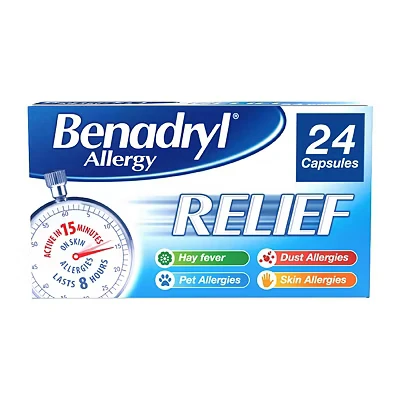 Fast allergy relief: Containing the active ingredient acrivastine, the Benadryl antihistamine medicine starts working in 15 minutes, providing quick allergy relief, and is suitable for hay fever symptoms Multi-symptom: Each Benadryl capsule acts quickly and lasts up to 8 hours, relieving itchy, watery eyes, runny nose, sneezing, and other allergic conditions such as pet, dust, and skin allergies For hay fever symptoms: The flexible dosing of the hayfever allergy capsules makes it ideal for hay fever sufferers as it can be taken in the morning and evening when pollen is at its peak How to use: Take one capsule up to three times a day. Do not take more than 3 doses in 24 hours. This allergy medicine is not recommended for children aged under 12 years or adults aged over 65 years Product details: Benadryl Allergy Relief Capsules (1 x 24 capsules), fast-acting antihistamine, suitable for allergy, hay fever symptoms, dust and pet allergy sufferers, and other skin allergies