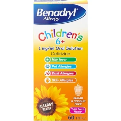 Long-Lasting Relief: Up to 24-hour* allergy relief from sneezing, runny and itchy nose Effective relief from allergies Sugar and colour-free allergy formula with Tutti Frutti flavour, the preferred taste for our children's formula, as voted by parents** Take control of your allergies: Provides long-lasting relief for dust, pet and skin allergies as well as hay fever, suitable for children aged 6 years and over and adults Product details: Benadryl Allergy Relief for Children 6+ Years (1 x 60ml), long-lasting relief for hay fever, dust, skin, and pet allergies with Tutti Frutti flavour