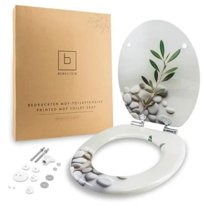 Stylish, durable and hygienic: trendy graphic prints with MDF premium coating and durable metal hinges ensure durability and style. The material made of high-quality urea thermoset plastic is antibacterial to restrict the spread of germs and colourfast to retain its original colour permanently. Quick release function: for quick and hygienic cleaning, the toilet seat is equipped with the quick release function. This allows you to remove the lid from the glasses at the touch of a button, clean it and reattach it. In addition, the rear buffers of the toilet lid float slightly in the air and only lower when sitting down, making sitting down and getting up even more comfortable thanks to the slightly springy effect. ✅ PERFECT MEASUREMENT: The top lid is suitable for most standard toilets and measures 435mm in length and 375mm in width. The bottom lid has a hole with a diameter of 230 mm (width) and 270 mm (length). The hinge width is adjustable and ranges from 130mm to 185mm to ensure a secure and individual fit for your toilet. ✅ Double soft-close mechanism: the soft-close function allows both the lid and the glasses to slide gently down. No one in the household is ever awakened by the noisy sound of a smashing toilet seat. ✅ EASY INSTALLATION: Install it in 4 easy steps: position the lid correctly on the toilet bowl, secure the hinges, adjust the seat and align it for a perfect fit, tighten all screws and enjoy your newly installed toilet seat!Designed for comfort and fit most standard toilets, it provides a comfortable and stylish addition to your bathroom, Weight: 6.7902376696 pounds, Manufacturer: Benkstein