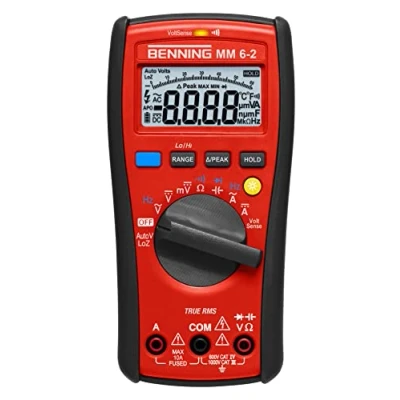 High quality multimeter with digital display Analogue bar display - 4-digit LCD display (6000 dots) Integrated voltage sensor signals non-contact phase voltages and cable breaks in lines (optical/acoustic) Smallest resolution DC voltage 0.1mV Max. Voltage measuring range DC 1000 V Includes rubber protective frame with magnetic hanger, bag, 9V block LR61 battery, test leads, fuse 11A (10218772)