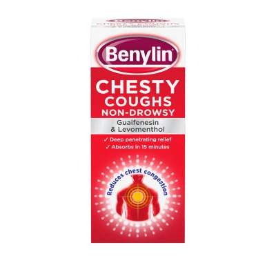 Boots18 Advantage card points. Benylin Chesty Cough - Non-drowsy. Soothing effect, deep penetrating reliefSee details below, always read the labelSuitable for: Adults and children aged 12 years and overActive Ingredients Guafenesin and Levomenthol FREE Delivery on orders over 45 GBP.