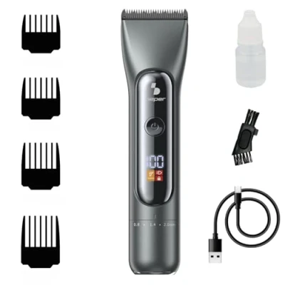 BEPER P304CAP010 Professional Men's Hair Clipper, Titanium and Ceramic Blades, LED Display, 4 regulating Combs, 2 speeds, 3h Battery Life, USB C Charging, Corded Cordless use