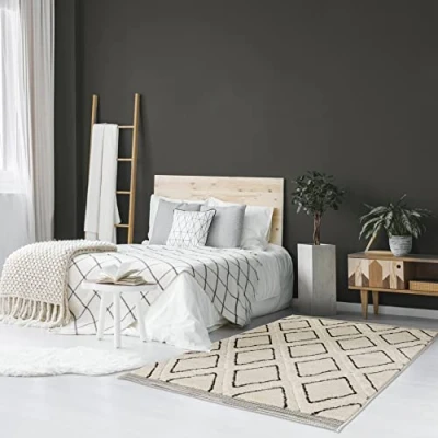 Berber Living Room Rug, Rug for Room, Bedroom, Soft and Comfortable, Easy Care, Flat Woven Thickness 22 mm, 100% Polypropylene, 120 x 170 cm, Black Cream