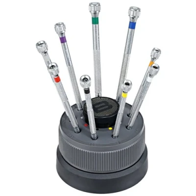 9 stainless steel watchmakers 4" screwdrivers with color coded and knurled shafts Blade sizes included are 0.50, 0.60, 0.80, 1.00, 1.20, 1.40, 1.60, 2.00, 2.50mm Rotating stand with storage Swiss made International products have separate terms, are sold from abroad and may differ from local products, including fit, age ratings, and language of product, labeling or instructions.