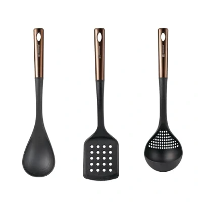 Set of 3 kitchen utensils consisting of Slotted Spatula 36x8.5x4.8cm, Spoon 36x8x4cm and Ladle 34x9x9cm Made from durable black PBT with elegant copper accents. Ideal for cooking and serving without scratching your pots or pans. Withstands temperatures up to 200 degrees Celsius, perfect for everyday use. Modern design, durable and easy to clean, indispensable in any kitchen.