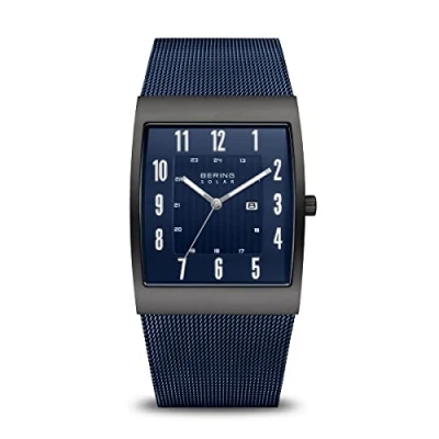 The SOLAR COLLECTION watches can use any kind of light will charge it and when fully charged it runs for 6-12 months, and with a solar movement The minimalistic BERING watch has a highly scratch-resistant and domed sapphire crystal with a blue dial The glamorous case is made of high-quality, black IP-plated Stainless Steel (316l). It is 8 mm wide and the diameter is 33 mm The strap is made of high-quality, blue IP-plated Stainless Steel (316l). It is 200 mm long and 29 mm wide Water resistant up to 3 ATM / 30 meters. Protected against rain and water splashes