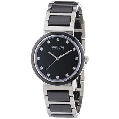 The CERAMIC Collection features a extremely slim design with a sleek and smooth material. Polished Silver Stainless Steel Case and Strap with Black Ceramic Links. Scratch Resistant Flat Sapphire Crystal protects your watch from damage. Water Resistant for up to 50 meters / 165 feet. Withstands Rain and Swimming but not Diving. International products have separate terms, are sold from abroad and may differ from local products, including fit, age ratings, and language of product, labeling or instructions. Bering time ladies ceramic quarz watch with black analog dial part ceramic strap 10729-az2 Part ceramic Black face with swarovski Saphire crystal Shiny silver case and part black ceramic band