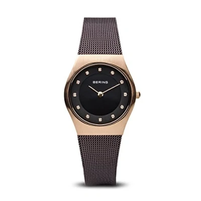 The classic collection watches are classic, puristic, and yet exciting - inspired by danish design, and with a quartz movement The minimalistic BERING watch has a highly scratch-resistant and flat sapphire crystal with a brown dial The glamorous case is made of high-quality, rose gold IP-plated stainless steel (316 L); It is 6 mm wide and the diameter is 27 mm The strap is made of high-quality, brown IP-plated stainless steel (316 L);It is 185 mm long and 18 mm wide Water resistant up to 5 ATM/50 meters; General resistance to splashing, showering but not to swimming, snorkeling or diving