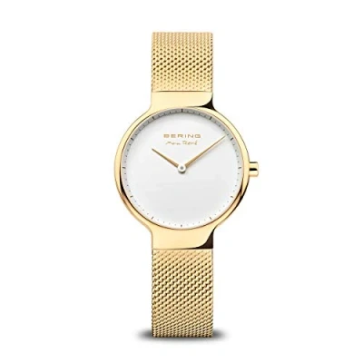 The Max René Collection | change colors, change straps, change looks - the strap can be changed in seconds | quartz movement Sapphire crystal - The minimalist Bering watch has a highly scratch-resistant and flat sapphire crystal with a white dial Case and bracelet - The case is made of gold IP-plated stainless steel. The case is 7mm flat and has a diameter of 31mm. The length of the bracelet is 165mm and the width is 14mm 5 ATM - The watch has a water resistance of up to 5 ATM - this means that it is protected against rain and splashes of water Gifts - Give the gift of great and unique watches and jewelry! At BERING you will find an individual gift for everyone - be inspired by our gift ideas and find the perfect BERING gift for him/her
