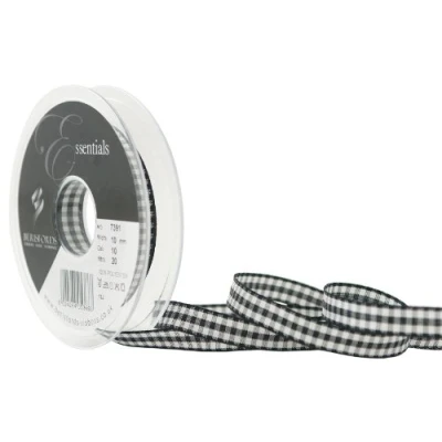Gingham ribbon is a traditional check Made from 100 percent polyester Fully washable Available in black colour Measures 20 metre length by 10 mm width