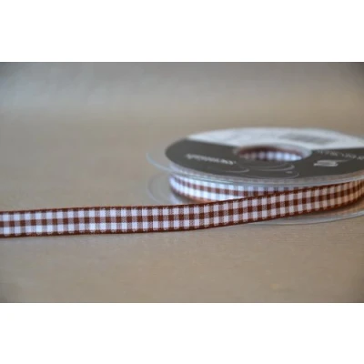 Gingham ribbon is a traditional check Made from 100 percent polyester Fully washable Available in brown colour Measures 20 metre length by 10 mm width