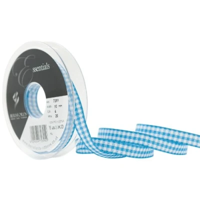 Gingham ribbon is a traditional check Made from 100 percent polyester Fully washable Available in peacock colour Measures 20 metre length by 10 mm width