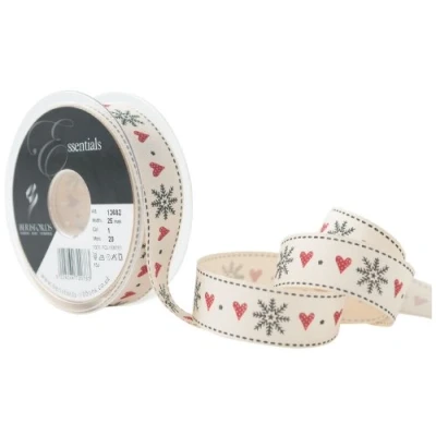 A pretty snowflake ribbon with a printed stitched edge brings warmth to the winter season Made of 100 percent polyester Two red hearts printed together with a small star Available in natural colour Measures 20 metre length by 25 mm width