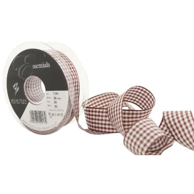 Berisfords 7391 20 m x 25 mm Traditional Check Gingham Ribbon, Brown