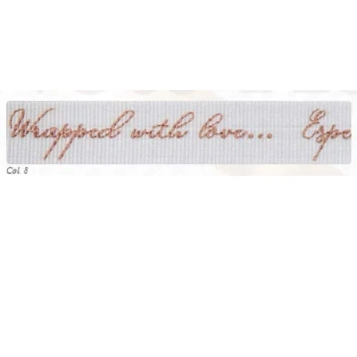 16mm width 20m Reel A beautiful UK manufactured ribbon Add a touch of sparkle to presents with this stylish foil printed design, choose from 8 colours for a truly personal message of ‘wrapped with Love especially for you.’ Perfect for crafting, gift wrapping, celebrations and apparel