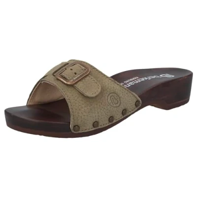 Trendy wooden mules with integrated footbed Selected leather and elaborate craftsmanship Nailed shafts with elegant metal buckle Light weight and pleasant feel thanks to the sole made of poplar wood 35 mm heel of the wooden shoes ensures a feminine appearance