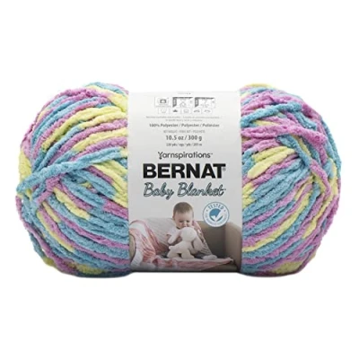Bernat Baby Blanket is a luxuriously soft, chenille-style yarn that's perfect for baby blankets and garments. Gauge: 6 - Super Bulky, the big gauge makes projects fly by Crochet Gauge: 7 sc and 8 rows with a 8 mm (U.S. L/11) crochet hook Knitting Gauge: 8 sts and 13 rows with a 8 mm (U.S. 11) knitting needle Content: 1 ball of yarn 100% polyester 10.5 oz/300 g, 220 yds/201 m.Care: Machine wash and dry.Recommended for: Knit and crochet baby blankets, hoodies, toys, mobiles, snuggle sacks and more!
