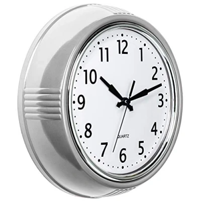 Decorate and enhance your home with this cool silver retro clock. Great for your kitchen, dining room, bedroom, classroom, office, restaurant or diner Silent non ticking sweeping movement for peace and quiet. Perfect for working and sleeping environments. Precise quartz mechanism guarantees accurate time 12" wide round wall clock. 1950s era design features a curved frame with raised lines and unique hands. Glossy finish. Black numbers against a white background create easy viewing from any angle Sturdy plastic frame with spherical convex glass lens keeps dust away from dial. Frame is 3" deep. Great for nostalgic retro, industrial, vintage, country, modern or mid-century decor Large nail slot offers easy no-fuss and fast installation. Uses 1 "AA" battery - not included (Note: Plus side of battery should be inserted first) 1 year manufacture warranty