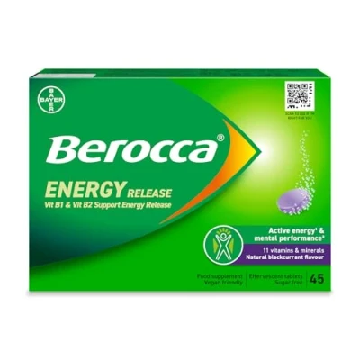 EFFERVESCENT VITAMIN C TABLETS - Each Berocca Effercescent tablet delivers a comprehensive blend of essential nutrients including a high strength dose of 500mg of Vitamin C and Zinc to help support your immune system and contribute to the maintenance of normal bones and skin. VITAMIN B COMPLEX - Berocca's effervescent tablets provide a complete Vitamin B complex. B1, B2, B3 & B7 naturally help generate energy from your food, B6, B9 & B12 help reduce tiredness & fatigue, whilst B5 supports normal mental performance. MULTIMINERAL BENEFITS - Berocca is enhanced with Magnesium and Zinc to not only support energy release but also contribute to the maintenance of normal bones. ONE TABLET PER DAY - With our soluble blackcurrant flavored tablets, just drop, dissolve, and drink once daily for a refreshing start to your morning, providing a simple solution for those with busy lifestyles FAMILY FRIENDLY - Our pack of 45 effervescent tablets ensures a consistent supply of essential nutrients, ideal for both women and men seeking daily immune support and a flavorful energy boost. This formula is free from sugar, caffeine, lactose and preservatives. Suitable for vegans.