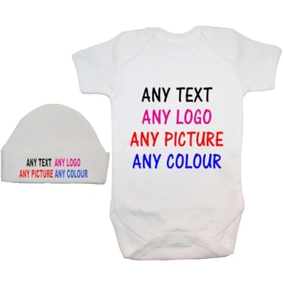 Bespoke Personalised Design Your Own Wording Baby Bodysuit/Romper/T Shirt & Hat/Cap Set 0 3 Months White