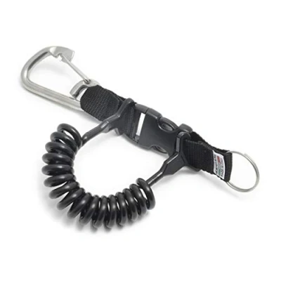 Extendable clip for attaching diving equipment Polyurethane spiral: ø30x6 mm Black color Stainless steel carabiner "strong" Stainless steel ring