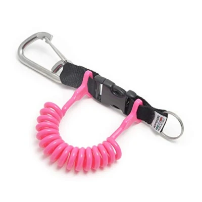 Extendible clip for securing diving equipment Polyurethane spiral: ø30 x 6 mm. Fuchsia colour "strong" stainless steel carabiner Stainless steel ring