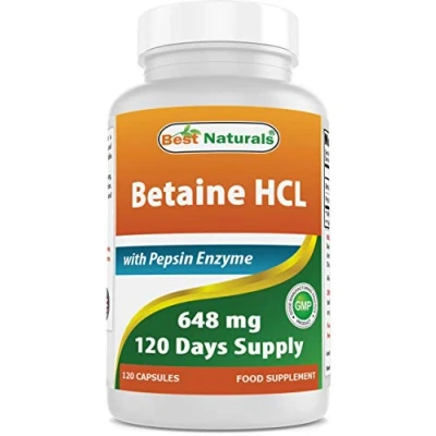 PROMOTES ACID LEVELS - Our Betaine with hcl formulation to help maintain proper stomach acid levels SUPPORTS HEALTHY DIGESTIVE SYSTEM - Our formula made with high quality betaine & pepsin which provides healthier nutrition to digestive tract HELPS DIGESTION OF PROTEIN - Our formula contains pepsin enzyme which helps breakdown of protein in digestive tract Each capsule contain 648 mg of Beatine HCl & 148 mg of Pepsin - 120 Capsules per bottle. Made with Strictest GMP standards