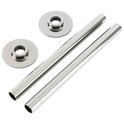AmazonModern pipe connectors for use with a heated towel rail or radiator Solid brass construction with chrome finish for long-lasting durability Allows connection between the valve inlet and the floor Includes two pipes and flanges Pipe dimensions (WxHxD): 50 x 185 x 15mm, Weight: 0.3747858454 Pounds, Manufacturer: BestBathrooms