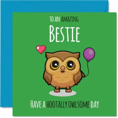 MAKE YOUR BESTIE SMILE WITH THIS UNIQUE BIRTHDAY CARD: This exceptional quality Bestie birthday card shows the design 'To An Amazing Bestie Have Hootally Owlsome Day'. If you are looking for an awesome birthday card for Bestie, then then this happy birthday Bestie card is bound to make them smile. Not just a birthday card for Bestie this could also be a birthday gifts for Bestie, Friend or Best Friend. WHAT DO YOU GET: The card is printed on one side and BLANK ON THE INSIDE to allow you to write your very own message. The unique fun design is printed on a specially sourced and environmentally responsible board. At 360 microns thick the natural white one-sided gloss board has a quality look and feel. Supplied with a coloured gummed envelope to complement the design and ready to be sealed and sent in the post. Great Bestie birthday cards, Friend birthday card. NO INK SMUDGES: There is nothing worse than writing inside a card to find that the shiny surface makes the ink smudge. This is why we use a high quality one sided coated board. The uncoated side will absorb more of the ink from your pen to make smudging a thing of the past. Bestie birthday cards, Bestie birthday cards from Best Friend. SIZES: Greeting Card = 145mm x 145mm, Envelope = 155mm x 155mm, Card Thickness = 360 micron. Happy birthday Bestie, Besties birthday card, Bestie cards birthday, birthday card Bestie, happy birthday Bestie card, Bestie gifts from Best Friend. MADE AND QUALITY CHECKED IN THE UK: We print and manufacture all our products right here in the UK so you can be sure of a fast turnaround and a product that is expertly made. Using environmentally responsible premium board our card is conscious of the responsible management of the world's forests - happy birthday card Bestie, Bestie birthday cards.