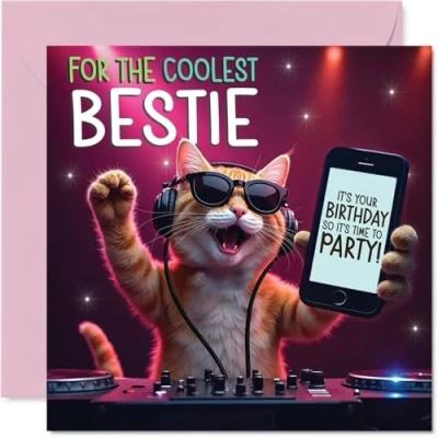 Bestie Birthday Card Party DJ cat Happy for from Best Friend Family, 145mm deejay Bday Greeting Cards