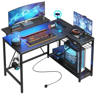 Carbon Fiber Gaming Desk: The corner gaming desk features RGB Strip Lights under the monitor shelf. Choose from 7 main colors and up to 22 display modes for an immersive gaming experience. Create a special atmosphere for gaming or enjoy exciting movies with a unique ambiance at home Convenient Charging: L Shaped Desk equipped with 3 power outlets and 2 USB ports for easy charging of your gaming devices, controller, laptop, or smartphone. Ideal for home office, gaming, or study sessions Spacious Storage Space: Dimensions of 106.5D x 82W x 91.5H provide ample storage. The small corner desks for small spaces create a stunning learning and workspace for your family and children. Includes a main tabletop, headphone hooks, and a removable computer stand Flexible Reversible Coner Desk: The L shaped corner desk maximizes the use of limited space, and the double storage shelves on the side can be placed on either side according to your usage habits and space planning.Put your files, books, headset or other stuff within arm reach Easy to Assemble: Comes with labeled parts and illustrated instructions for hassle-free assembly. Each computer desk includes assembling instructions