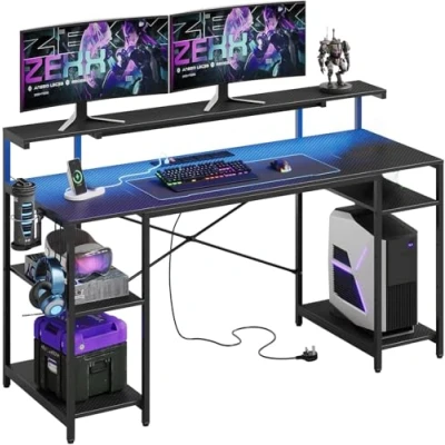 Bestier 140 CM Computer Desk with Power Outlets & LED Lights Monitor Shelf Gaming Shelves Writing Storage Office &Workstation for Home Bedroom