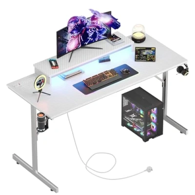 Bestier Gaming Desk 131.6 CM with Power Outlets & LED Light Computer Monitor Stand Gamer Workstation Cup Holder Headset Hooks for Home Office Bedroom